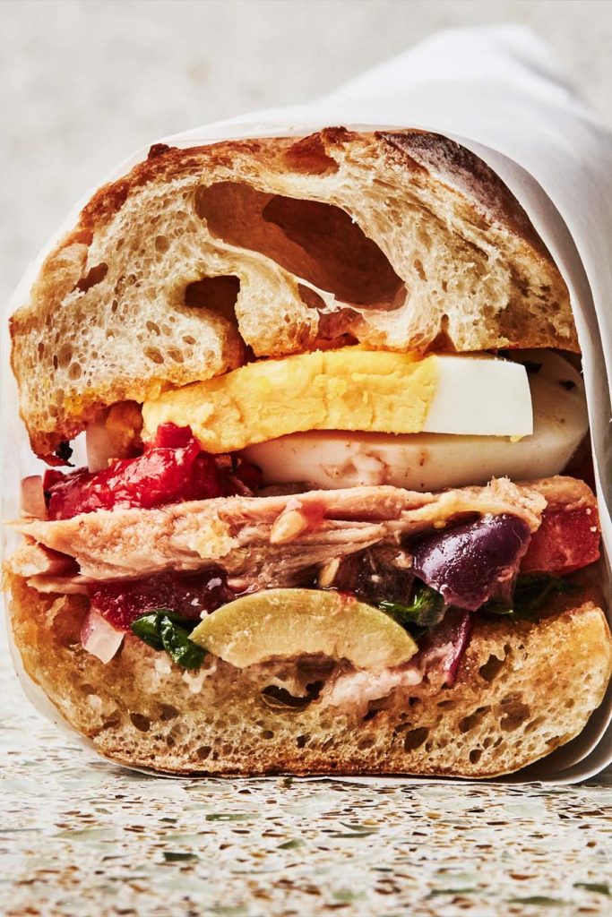 Another emblematic local treat is pan bagnat, (shown) a round-shaped sandwichfilled with tuna, hard-boiled eggs, anchovies, black olives and raw vegetables, and soaked in olive oil. Essentially, a salade niçoise in a bun! Try some of the best in town at Lou Balico in front of the MAMAC museum, Kiosque Chez Tintin next to the Libération market or La Gratta by Port Lympia.